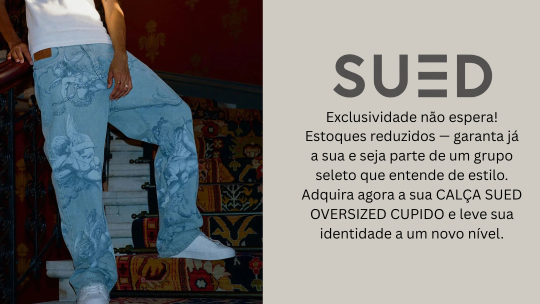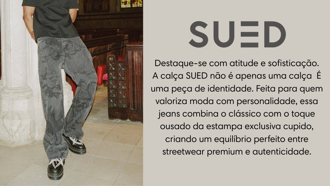 - Com estampado Cupido em toda a peça. Estes jeans apresentam um corte reto descontraído e largo num acabamento azul lavado, e cinza realçado com detalhes de tachas de metal.